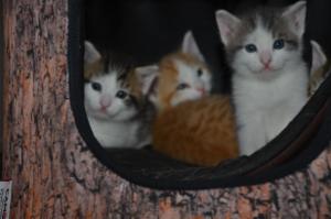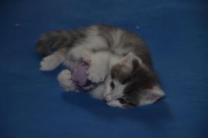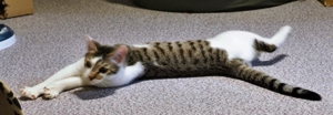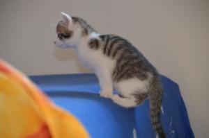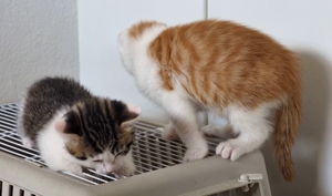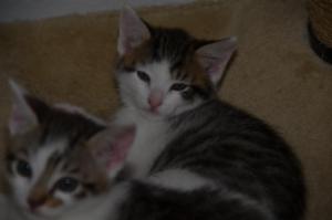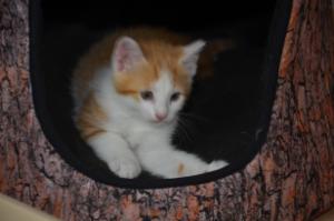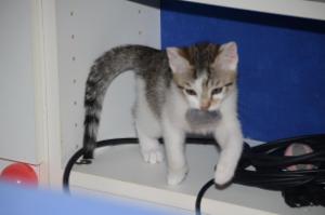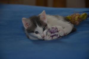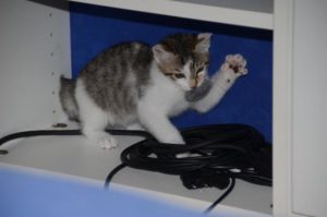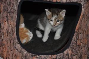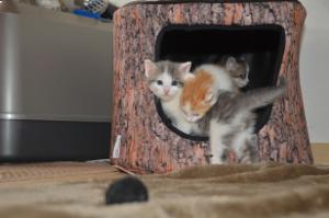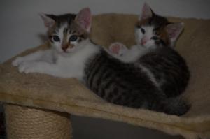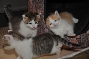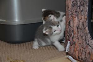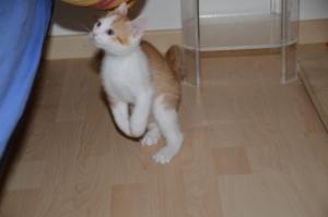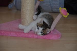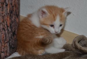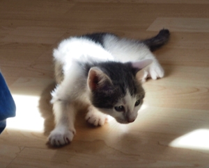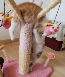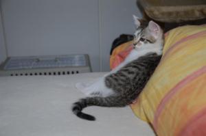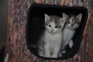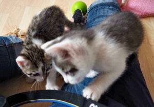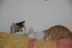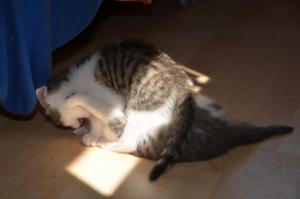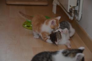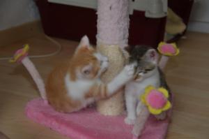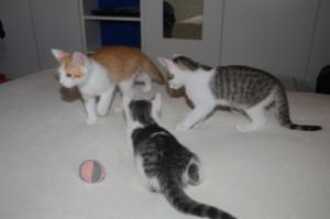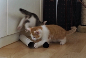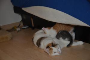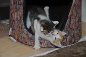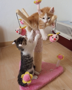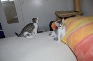 Ansonsten geht es uns prächtig. Wir sind gesunde, wohlgenährte Kätzchen und fit wie Turnschuhe. Wenn wir unsere knappen 5 Minuten haben ist es besser man steht uns nicht im Weg. Wir überrollen alles und rennen hintereinander her, jagen über das Bett, die Kratzbäume oder die Menschen