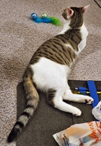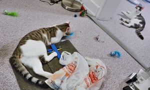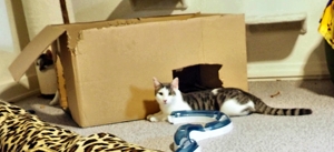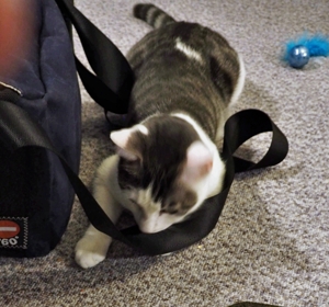 Gizmo liebt alles was raschelt, ganz besonders Kartons und er vergrössert hingebungsvoll jede Öffnung. Caio steht besonders auf alles was Gurten hat, sei das ein Rucksack oder eine Tasche und er schlüpft sofort in die Gurte, sobald etwas herumliegt. Gerne apportiert er auch, vor allem die Filzherzchen, die einmal eine Kette bildeten. Die zwei sind aufgeweckte und neugierige Jungkater, die alles untersuchen müssen. So ist Caio auch einmal in den Tank mit Osmosewasser gefallen, als der Besitzer ihn öffnete um Wasser für ein Aquarium zu entnehmen und er schafft es Schubladen und Türen zu öffnen