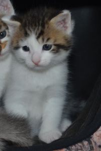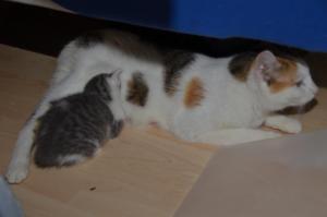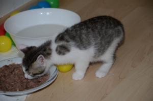 Wir futtern noch nicht, da unsere Mama dafür sorgt, dass wir lieber ihre Milch trinken, anstatt uns von Katzenfutter zu ernähren, doch Manu ist sich sicher, dass das in den nächsten Tagen ändert. Sie staunt oft, denn obschon sie uns Katzenfutter serviert und wir Mami zuschauen, wie sie es verschlingt, wir dennoch weiterhin abgeneigt sind, es zu probieren…
