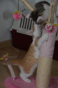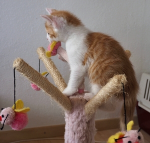 . Es wurde mit allem gespielt, was gerade greifbar war, vor allem die kleinen Filzbällchen wurden mit grosser Begeisterung herumgetragen. Meistens haben sich die kleinen Racker aber im Klettern und herumbalgen miteinander geübt.