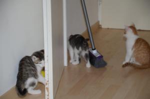 Wir alle helfen ebenso beim Boden kehren, d.h. wir setzen uns direkt vor den Besen und scheuen uns nicht davor. Wir bleiben einfach sitzen! Manu und Margot dürfen dann rund um uns herum kehren und wir versuchen den Besen zu attackieren und ihm den Gar aus zu machen. Doch leider reagiert er nicht auf unsere Angriffe