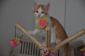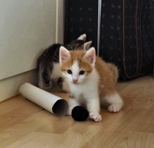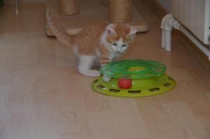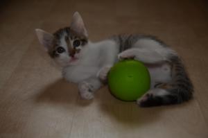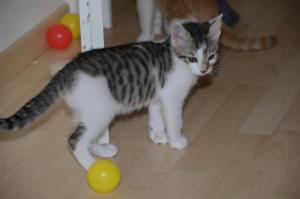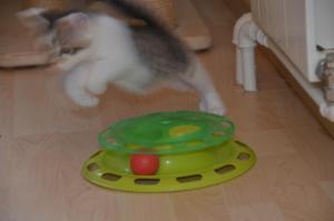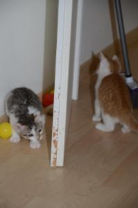 Jedes Spielzeug ist uns recht und wenn die Zwischentüre offen ist, versuchen wir immer durch den Türspalt hindurch die Bällchen dahinter zu jagen. Manu passt dann immer wie ein Falke auf, dass die Türe sich nicht bewegt, denn sie könnte unsere Pfötchen einklemmen, was unser Pflegemami zu verhindern weiss.
