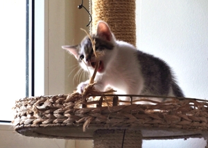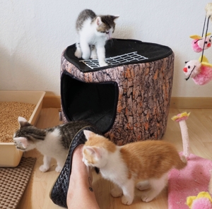 Nun sind wir fast vier Wochen im Cats Castle und haben unser Gewicht bereits verdreifacht. Wir haben gelernt fast überall hochzuklettern, einzig die obersten Etagen der grossen Kratzbäume sind noch etwas zu hoch für uns. Doch das kommt sicher noch, versprochen