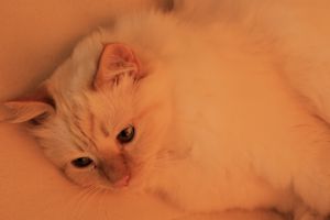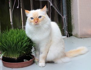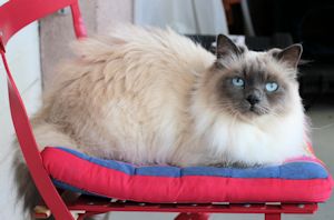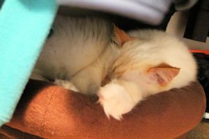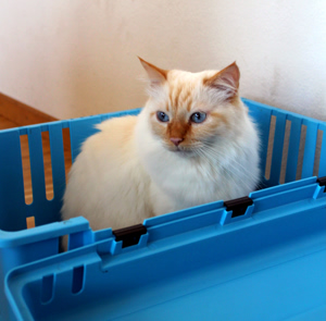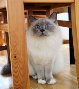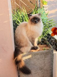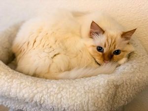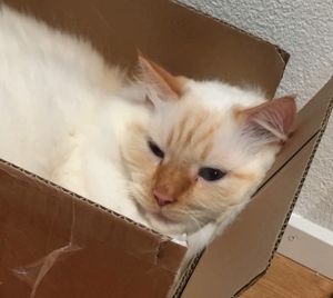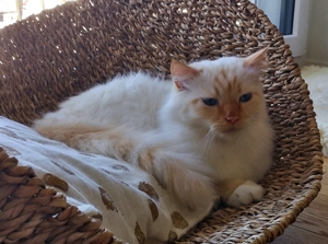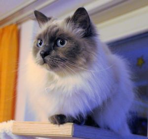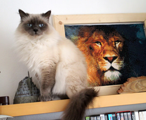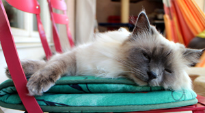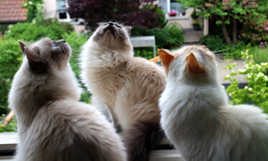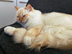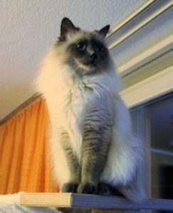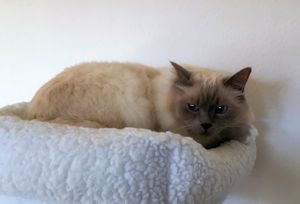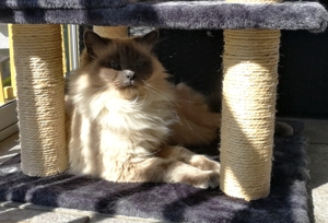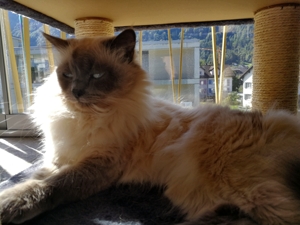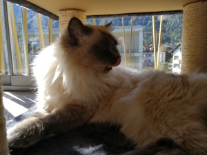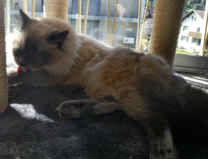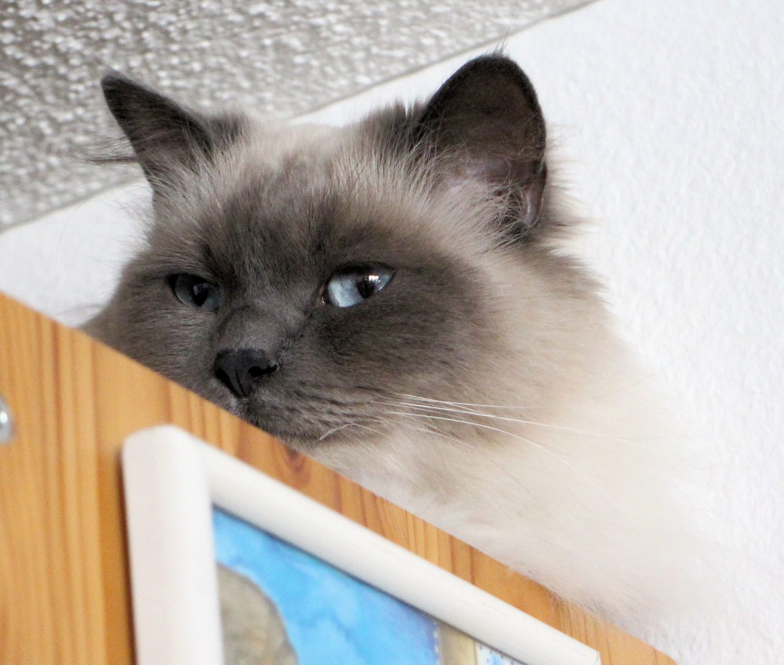 Nala, die Diva der Gruppe, lag oben auf einem Schrank und schlief tief und fest. Laut ihren Besitzern bevorzugt sie höhere gelegene Liegeplätze, wie zum Beispiel die oberste Plattform des Katzenbaums im Wintergarten. Sie braucht auch am ehesten ihren Raum und lässt sich nur streicheln, wenn es ihr gerade passt