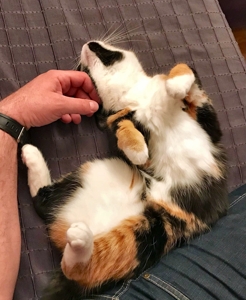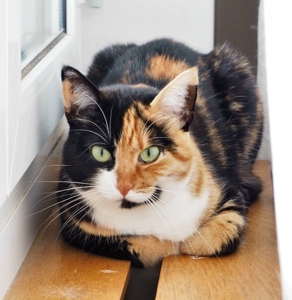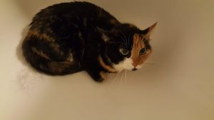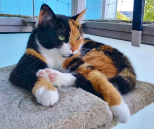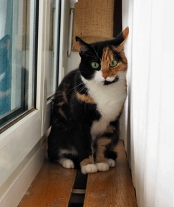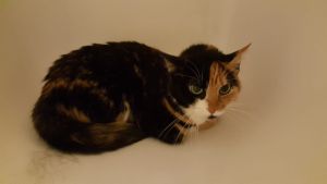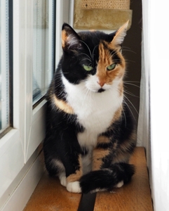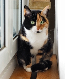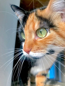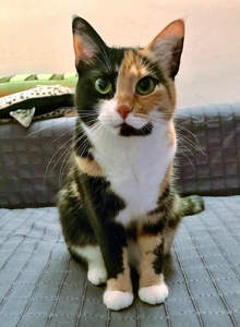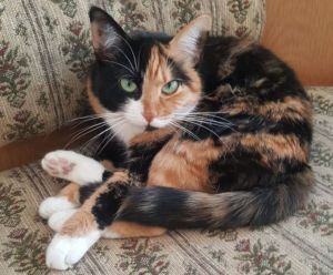 . Ihr wunderschönes dreifarbiges Fell glänzt und ihr tollen grünen Augen leuchten. Sie scheint sich sehr wohl zu fühlen. Mit dem Besitzer kuschelt sie abends gerne vor dem Fernseher.