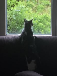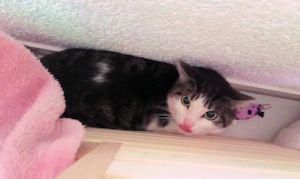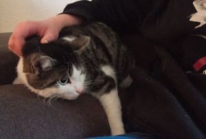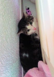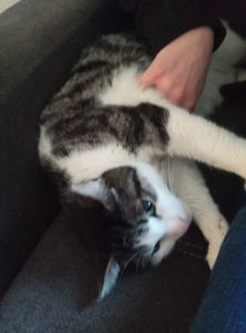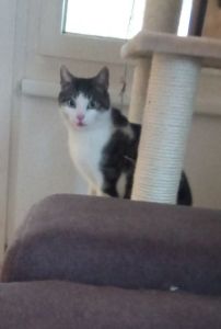 Ich kann aus dem Wohnzimmer eine zweite Stimme hören, eine Stimme die ich nicht kenne. Irgendwie macht mich das neugierig, also flitze ich so schnell es geht, aus dem Katzenzimmer hinter das Sofa im Wohnzimmer. Eigentlich, denke ich mich hat niemand bemerkt, aber dann guckt meine Pflegemama um die Ecke, Mist