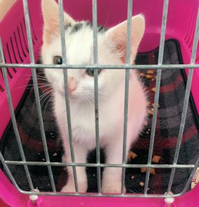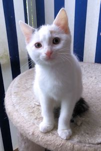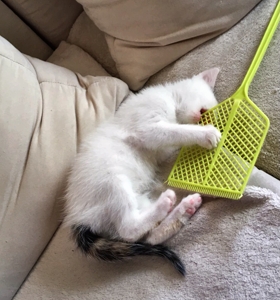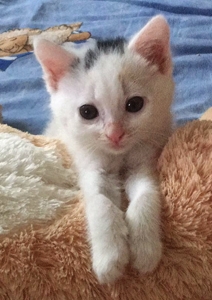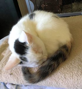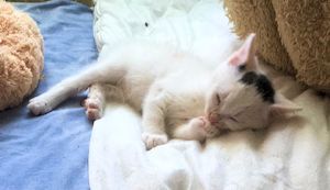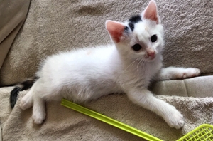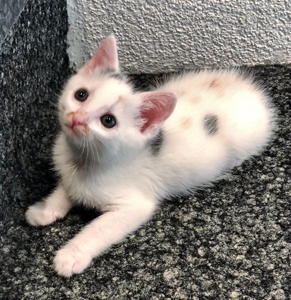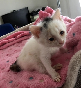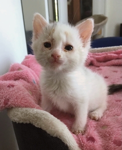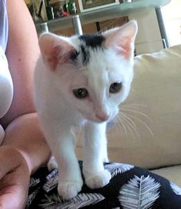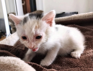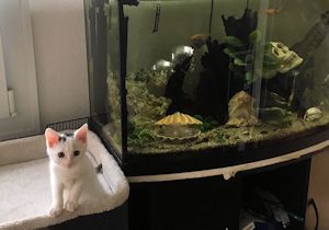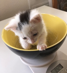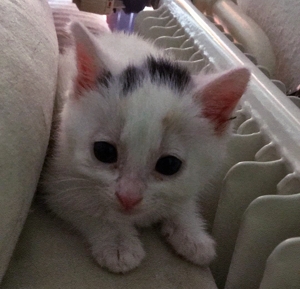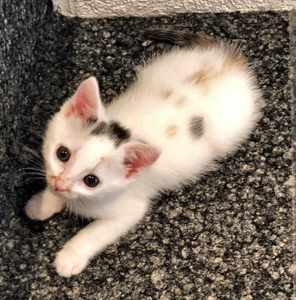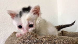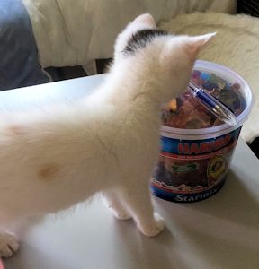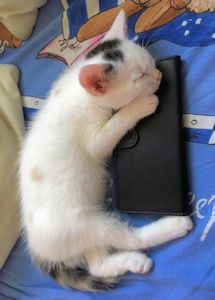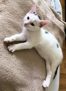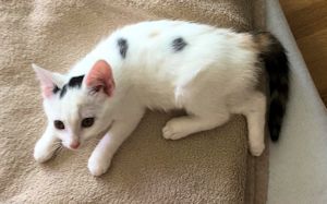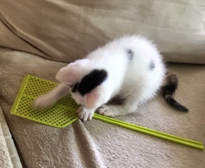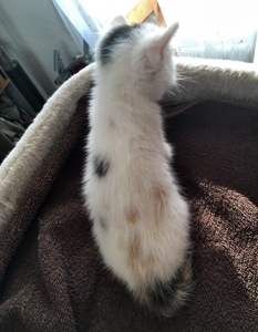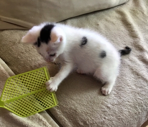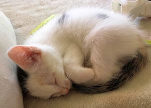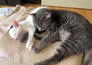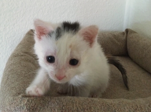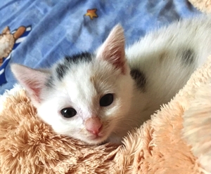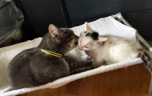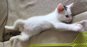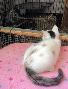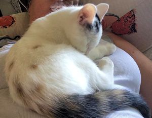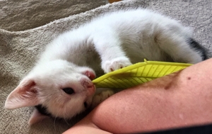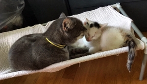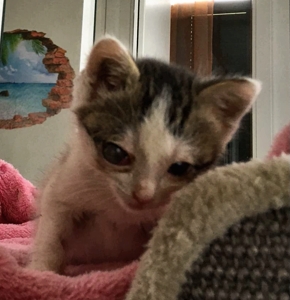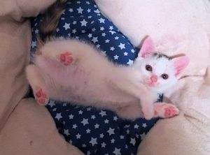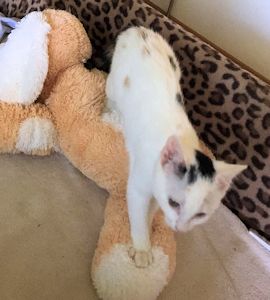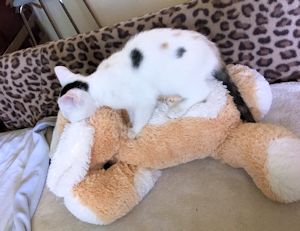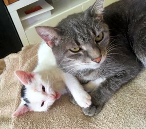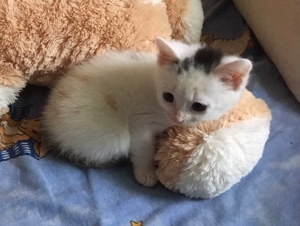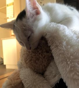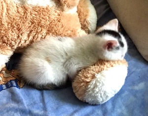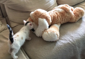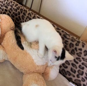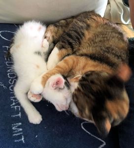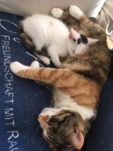 . Ich schmuse mit allen, mit der Pflegemami, mit dem Plüschhund und auch mit den anderen Katzen.