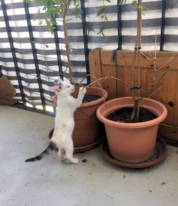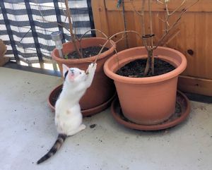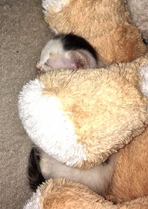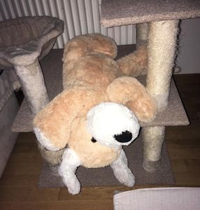 . Auch mein Plüschwelpe ist noch immer hoch im Kurs. Leider setzt ihn das Pflegemami immer auf den Kratzbaum, was ich gar nicht mag. Und so zerre ich ihn an den Ohren halt wieder runter. Oder auch am Plüschsäuli habe ich meinen Spass.