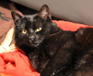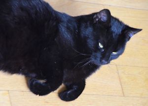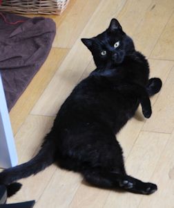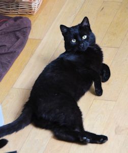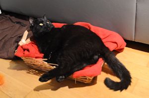 Bagheera war von seiner morgendlichen Runde bereits zurückgekehrt und machte ein Nickerchen. Durch das Katzentor kann er selbständig auf Streifzüge gehen, wenn es ihm danach ist.