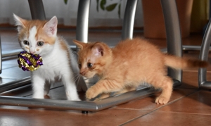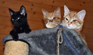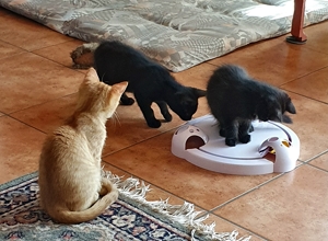 Nachdem unser Pflegepapi die Transportbox und sich gereinigt hatte, brachte er noch Futter für uns alle und hat sich noch etwas mit uns beschäftigt. Danach hatten wir erst mal Zeit um uns kennenzulernen und zu spielen (die vier schwarzen wollten aber erstmal schlafen und wieder zur Ruhe kommen). Am späteren Nachmittag durften wir dann endlich wieder aus dem Zimmer und die Wohnung auf den Kopf stellen