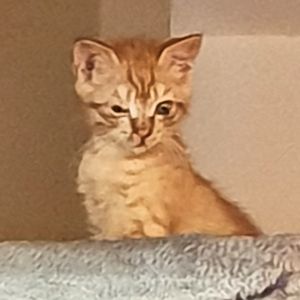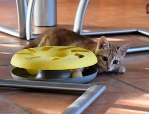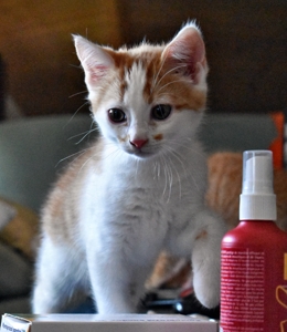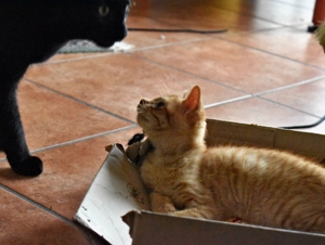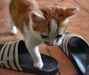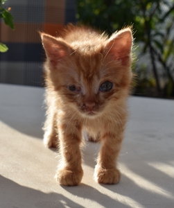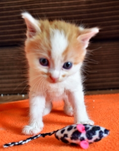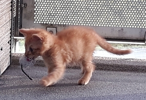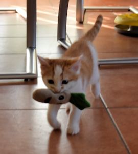 Er hat bisher alle Behandlungen geduldig über sich ergehen lassen und inzwischen geht es ihm so gut, dass in wenigen Tagen sein schlimmes Auge operiert werden kann. Er sieht mit dem Auge, aber durch die heftige Entzündung sind die Lider teilweise zusammengewachsen, was sein Sehfeld einschränkt. Dadurch kann er Distanzen nicht so gut abschätzen. Das hindert ihn aber nicht daran, voller Hingabe zu spielen und herumzurennen. Er ist sehr clever, schaut vieles von seinem Bruder ab und macht ihm alles nach. Er liebt alles wo man reinkriechen oder -steigen kann, Kartonschachteln, Papiersäcke und bei meinem Besuch einmal mehr die Plastiktüte mit den Spielsachen