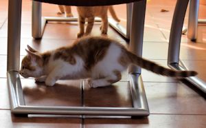 Brüderchen Speiky hat es sich zum Hobby gemacht Kaitano den schwarzen Hauskater durch die Wohnung zu jagen. Auch muss unser Pflegepapi aufpassen, wenn er in der Küche was richtet, dass er nicht an ihm hochklettert um auf die Küchenabdeckung zu kommen! Er ist aber auch vor mir und Speedy nicht sicher, denn wir klettern sehr gerne auf ihm herum (hi, hi, Ihr solltet mal seine Beine und den Rücken sehen!