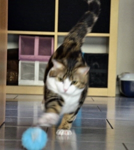 . Über Schränke, Regale, Fenstersimse und hat dabei sehr weite Sprünge gemacht, so dass wir nur Augen machen konnten. Am verdattertsten habe ich wahrscheinlich geguckt, als sie schliesslich einfach in die Transportbox wanderte. Welchen Sinn hat dann die Aktion davor gemacht, wenn man eh freiwillig rein geht