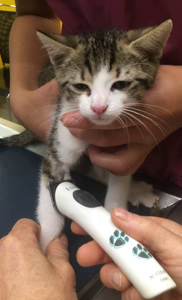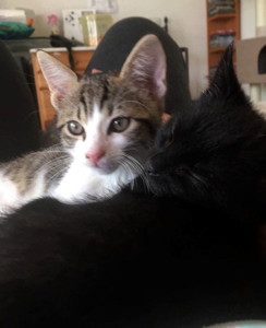 . Ich wollte natürlich zuschauen, was mit Himari passiert, also kletterte ich kurzerhand am Hosenbein der Arzthelferin hoch, hihihi. Die fand das nicht so toll wie ich… und schon war ich im Arm meiner Pflegemami. Weil diese gleich los musste, brachte uns die Mami unserer Freunde dann nach Hause. Wir waren geschafft und stellten für einmal nichts mehr an