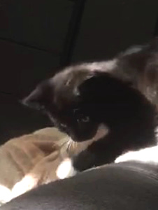 Aisha ist noch nicht begeistert über die 2 Kleinen, sie faucht und knurrt, aber keine Anzeichen von Angriff