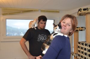 Endlich ist es soweit und wir zwei, Lacus (Heaven) und Lordy (Buddy), dürfen ins neue Zuhause umsiedeln. Unsere Besitzer kündigten sich schon vor Tagen an und da sie wissen wie sehr das Herz von Manu an uns hängt, wollten sie nicht einfach vorbei kommen, uns einpacken und wieder abhauen, sondern sie blieben länger zu Besuch. Zuerst spielten und schmusten sie mit uns allen, knuddelten noch jedes unserer Gruppe lieb durch, denn alle haben sich in ihre Herzen geschlichen