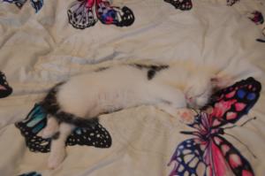 Unsere kleine Bella ist in den letzten Wochen enorm gewachsen und hat viel an Gewicht zugenommen. Nach den Anfangsschwierigkeiten ist sie jetzt bereits bei 1.1 Kilogramm. Bella liebt es zu essen und ist viel beim Futternapf anzutreffen. Dementsprechend strotzt sie nur so vor Energie, sie liebt es mit den Geschwistern zu kämpfen und zu spielen und kann dabei auch mal so richtig frech sein. So beisst sie gerne mal unerwartet in einen unserer Zehen oder Finger oder schleicht sich bei den Geschwistern von der Seite an. Das Haushaltspapier oder irgendwelche Blätter oder kleine Gegenstände sind ihr Lieblingsspielzeug, sie zerreisst, verbeisst oder zerstört diese Dinge schon mal gerne. Bella ist aber auch so richtig anhänglich und verschmust, am liebsten liegt sie mit ihren Geschwistern herum, kuschelt sich in unseren Schoss oder lässt sich von den Geschwistern putzten. Am liebsten liegt sie aber auf unserem Bett, wo man sie wegen ihrer Bettdeckenähnlichen Farbe schon mal übersehen kann.