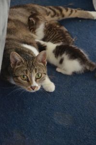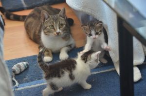 Ansonsten erkunden wir nun das ganze Wohnzimmer und sind überall zu finden, was unserem Mami nicht sonderlich passt. Sie überwacht uns stets und faucht Manu an, auch wenn sie nur die leer gefutterten Schälchen ersetzen will. Mit Argusaugen schaut sie dem Treiben zu und findet es eher mühsam, dass jedes von uns in eine andere Richtung läuft.