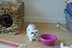 Ich lerne schon wie die Grossen aus dem Napf zu fressen. Meistens stehe ich dann immer gleich in das Futter rein und bediene mich. Danach sehe ich immer sehr lustig aus. Gut das ich dann zu Mama in die Waschanlage kann