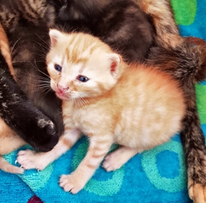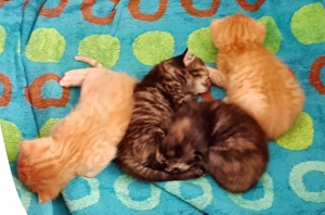 Nun, ich kann Euch sagen, mir gefällt es eigentlich ganz gut hier. Es ist ruhig, die ganze Familie ist sehr lieb, auch die Kinder, und ich bekomme soviel Futter wie ich essen kann. Mir gefällt es nur nicht so sehr, wenn sie meine Babys rausholen. Da muss ich immer sofort hinterher und sie zurückholen. Sie sind ja noch soooo klein. Ich denke, ich halte es hier gut aus und es wird gut für mich und meine Kleinen gesorgt