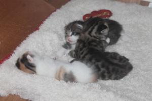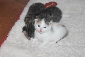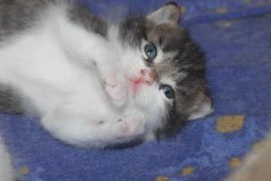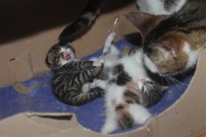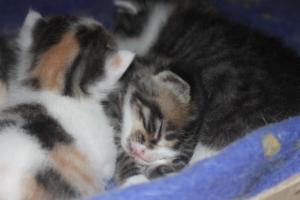 Schon 4 Wochen bin ich nun hier in der Pflegestelle und meine Babys sind nun auch bald so alt. Sie sind richtig gewachsen und gross geworden und haben (natürlich) schon längst die Welt mit ihren Kugelaugen entdeckt! Auch verzaubern sie unser Pflegemami mit ihrem Charme und kraxeln immer gleich zu ihr auf den Schoss, wenn sie uns besucht! Ich geniesse dann die Pause und putze mich ausgiebig oder verputze das Futter in meinem Napf. Natürlich geniesse ich auch die Kopf-bis-Fuss-Streicheleinheiten und auch gebürstet werden finde ich super!