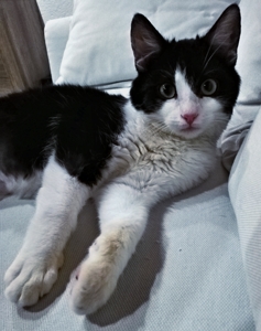 . Und dann steht noch jemand anderes in der Türe und faucht mich an wie blöd. Das muss wohl Fiona sein. Uii, der traue ich gar nicht über den Weg, die scheint richtig böse zu sein. Ich widme mich wieder Monti, der nun vor mir auf dem Rücken liegt und mich zum Spielen auffordert. Naja, ich weiss nicht, er ist so gross und stark.