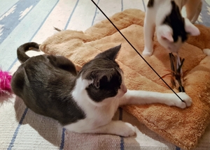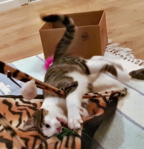 Aliano und Cooper sind die zwei, von denen ich anfangs glaubte, sie würden sich ganz schnell zu Schmusemonstern ändern. Obwohl sie grosse Fortschritte gemacht haben, sind beide nach wie vor ein bisschen zurückhaltend, legen sich aber mittlerweile in meine Nähe und lassen sich ebenfalls streicheln. Ganz langsam merken sie, dass das gar nicht so übel ist. Geht man aber zu hastig auf die beiden zu, sind sie immer noch ein bisschen ängstlich. Beim Spielen schaut Aliano den anderen immer erst etwas zu, bis ihn dann irgendwann nichts mehr hält