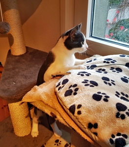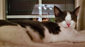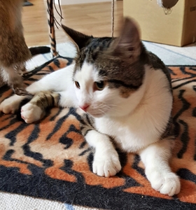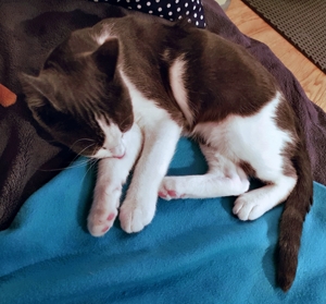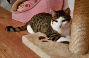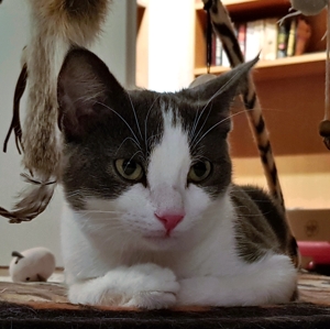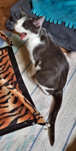 . Dabei geht sein Motörchen sofort los und er schnurrt richtig laut. Manchmal steht vor lauter Eifer sein kleines Mäulchen etwas offen und das Schnurren wird doppelt so laut und hört sich lustig an. Whiskers ist ein kleines Schlitzohr und stiftet oft seine Brüder zum Herumtoben an. Wenn man hereinkommt, kann er einen mit seinen wunderschönen Augen aber so unschuldig anschauen, dass man gleich hin und weg ist. Sein glänzendes blau-weisses Fell machen aus ihm eine richtige kleine Schönheit