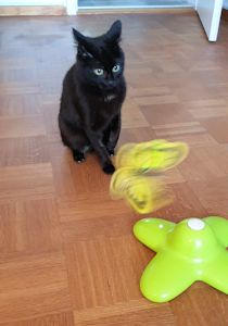 . Mein Lieblingsspielzeug läuft mit Batterie, das heisst, er fliegt an einem Draht im Kreis herum und ich muss ihn versuchen zu fangen. Das wird immer eine wilde Angelegenheit und ich kann mich fast Stunden mit diesem Ding beschäftigen. Da ich immer so wild bin, musste meine Pflegmami schon ein paarmal den Schmetterling austauschen, weil er zerfetzt war. Zum Glück kaufte sie eine Reservepackung dazu. Sie wusste wahrscheinlich, dass die nicht lange halten würden, bei meiner Spielkunst