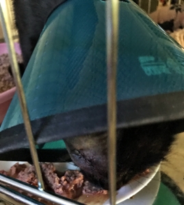 Als ich sie abholte, erschien sie mir wie vorher zu sein, wunderschön und mit viel Persönlichkeit. Man merkt jetzt richtig, dass sie schon vorher auf dem Auge nichts mehr sah, denn sie zeigt weder Orientierungs- noch Gleichgewichtsprobleme. Das einzige, was ihr ein bisschen zu schaffen macht, ist der dumme Kragen, aber inzwischen kann sie auch damit umgehen