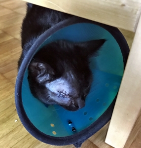 . Der Tierarzt sagte, dass sie ganz brav war und sich sicher bald erholen wird. Zuhause angekommen und noch voll im Narkoserausch musste sie erst einmal in einen Käfig, damit sie den Rausch ausschlafen und nirgendwo runterfallen konnte, da sie auch noch einen Kragen tragen muss und daher recht eingeschränkt ist. Am nächsten Tag durfte sie raus und ein bisschen durch die Wohnung torkeln, natürlich unter strenger Beobachtung, da die Gefahr gross ist, dass sie vom Kratzbaum runterfällt