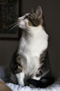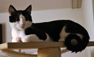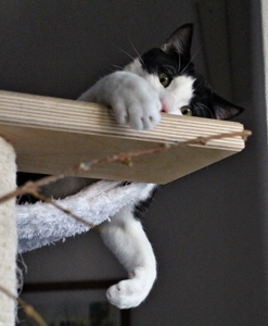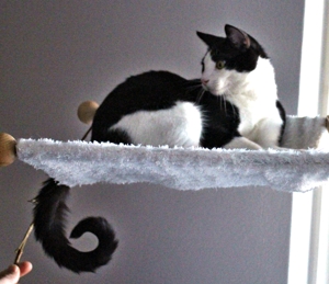 Wenn er spielen will, schaut er ganz keck umher, als würde er sagen, jetzt will ich jagen gehen. Toll findet er es, wenn die Spielangel „fliegt“, das macht ihn ganz wild, er versucht dann, mit immer höheren Sprüngen die Angel zu erwischen