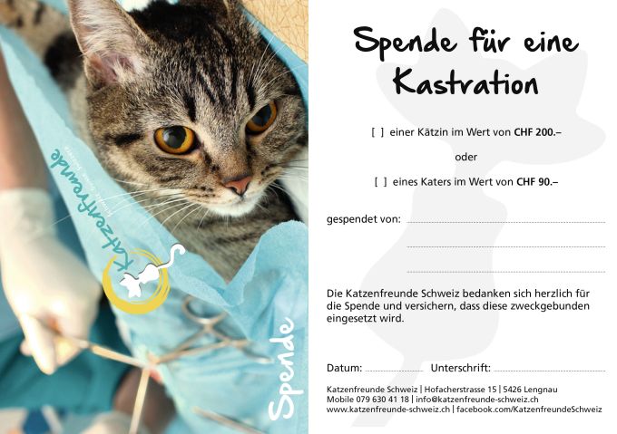 Helfen Sie uns mit dem Kauf eines Kastration Gutscheines! Auf diese Weise können wir weiterhin die Kastrationen von Bauernhofkatzen sowie unseren Schützlingen sicherstellen und garantieren, dass die kompletten 100% des Erlöses für unsere Pfleglinge eingesetzt werden, die Ihre Hilfe dringend benötigen. Wir werden diese Gelder NUR für Kastrationen einsetzen, das versprechen wir Ihnen!