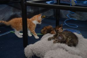 Eingentlich wäre es nun an der Zeit gewesen, dass wir in die neue Pflegestelle ziehen, denn Manu wollte nicht so viele Kitten über längere Zeit bei sich haben. Doch leider bekamen die Hunde der neuen Pflegestelle Giardien und da diese für uns ziemlich gefährlich werden können, entschieden die Menschen, dass wir nun doch unsere Zeit bei Manu verbringen dürfen. Uns freut das natürlich sehr, denn so können wir weiterhin mit unseren Kumpels herum toben und die ganze Bude auf den Kopf stellen