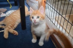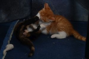 Nun sind wir schon ein paar Wochen hier in der Pflegestelle und haben uns von unsicheren und eher zurückhaltenden Kitten zu richtigen Frechdachsen entwickelt. Wir sind richtig mutig geworden und geniessen es sehr, wenn man mit uns spielt, uns knuddelt oder sich einfach mit uns abgibt. Natürlich sind wir gegenüber Fremden etwas vorsichtiger als bei unserem Pflegepersonal, aber meist durchschauen wir in wenigen Minuten die Lage und sind dann kaum zu bremsen. Gerade wenn man mit uns spielt, lassen wir uns gerne nehmen und schnell durchknuddeln. Einzig Ural muss sich einige Minuten länger heraus nehmen um die Situation zu prüfen, doch auch er lässt es dann gerne zu, dass die Menschen lieb zu ihm sind und dann lässt er auch sein Motörchen laufen und zeigt, wo er es am liebsten mag