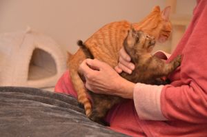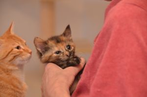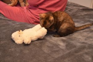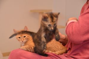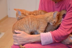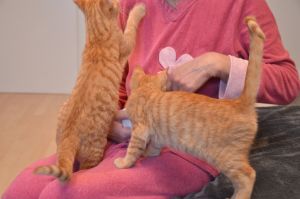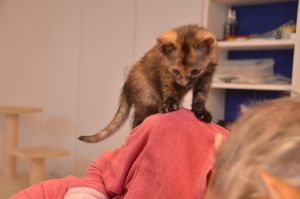 Nachdem sie und Margot sich ausgiebig von Fipps verabschiedet und die neuen Besitzer zum Auto begleitet hatten, kamen sie zurück, denn Barbara war noch bei uns im Zimmer und freute sich auf die gleiche Prozedur, denn sie wollte endlich Fox (Tick) und Lucy (Nikita) heim nehmen, wo ihr Partner alle schon ungeduldig erwartete. Er konnte nicht mit dabei sein, da eine Telko ihn davon abhielt und er hibbelte natürlich gewaltig, um seine süssen Kätzchen endlich in die Arme schliessen zu können. Dirk hatte nämlich so einige Male als Lebendkratzbaum für Fox hinhalten müssen und statt den kleinen Klettermaxe in die Schranken zu weisen, grinste er jedes Mal, wenn Fox seine Angriffe startete und an ihm hoch kletterte.