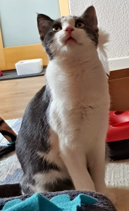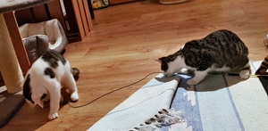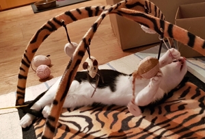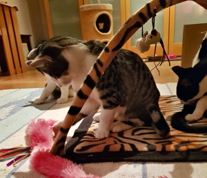 . Der fasziniert uns total und wir kriegen nie genug davon. Blöderweise verschwindet er jeweils plötzlich wieder und taucht ganz woanders wieder auf. Bakari liebt noch immer seine grüne Raupe und wir anderen drei spielen mit allem, was uns gerade in die Pfoten kommt. Wir vier verstehen uns super und spielen auch gerne miteinander.