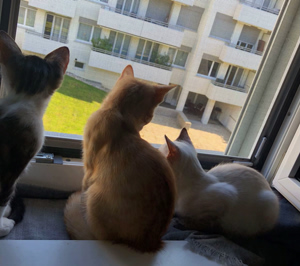 Mittlerweile hat sie angefangen, mit ihrem Trockenfutter zu spielen und es in der halben Wohnung zu verteilen, zum Glück sind ihre Brüder meist gleich zur Stelle, um hinter ihr herzuräumen. Anstatt zu versuchen, die Vögel vor unserem Fenster zu fangen, scheint sie einfach neben ihnen sitzen zu wollen und die Aussicht gemeinsam mit ihnen zu geniessen
