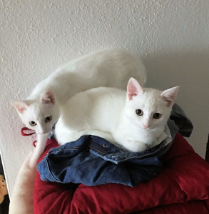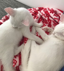 Sturmfreie Bude: naja, ich musste leider wieder arbeiten gehen. Und fragte mich, ob das 8 Stunden gut geht, alleine mit den Grossen… ich kam von der Arbeit nach Hause und sah wie eine vom meinen den kleinen Snowfox abschleckte und der andere mit Aragon spielte. 2 von 3 Katzen haben ein bisschen die Elternrolle für die Kleinen übernommen. Aragon hat einen grossen Spielkumpel gefunden, der mit seiner Energie klar kommt und der kleine Snowfox eine Putzerin. Ich war positiv überrascht.