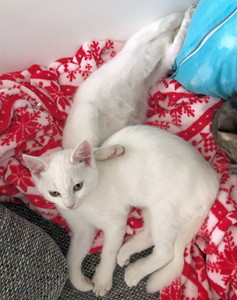 An einem Tag hatten wir Besuch von einem kleinen Mädchen. Aragon war hochbegeistert davon. Er spielte mit ihr oder sie mit ihm. Da er seine eigene Kraft noch nicht einschätzen kann und noch nicht richtig weiss was er darf und was nicht, gab es halt ein, zwei Kratzer. War aber beiden egal, sie spielten trotzdem weiter. Und Snowfox, wie er auch so ist, hat mal wieder alles verschlafen. Er lag da auf dem Tisch eingekuschelt und machte keinen Wank.