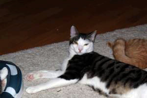 Wir sind aber auch sehr anhänglich, manchmal aber auch ganz schön eifersüchtig aufeinander (Sinus und Norek) und zicken dann gegenseitig etwas herum bis der andere den Platz räumt beim Pflegemami. Die beiden Girls lieben den Kater Juno, der hier lebt und schmusen und kuscheln ständig mit ihm