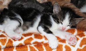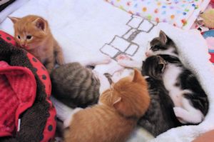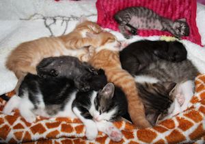 Ich bin sehr froh, dass das Pflegemami regelmässig mit einer Flasche Milch für die Minis vorbeikommt und natürlich mit Futter für mich! Alle Babys lieben die Besuche des Menschen und belagern sie dann sofort von oben bis unten. Dann habe ich wenigstens etwas Ruhe und kurz Zeit für mich! Eigentlich ist es hier ja nicht so schlecht, ich bekomme ständig Futter vor die Nase gesetzt, ein Klo ist in der Nähe und ich werde vor allem von Kopf bis Fuss gestreichelt… Und das Tolle daran, ich werde jeden Tag geknuddelt