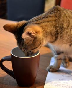 Der sehr verfressene Zazu hat die lustige Angewohnheit liegend zu essen. Wobei er meist mit den Pfoten den Futternapf umklammert und dabei lustvoll isst. Diesbezüglich muss aber gesagt werden, dass Zazu trotz lustvollem Essen, leider nicht nach Knigge isst, da oftmals ein Teil des Futters neben dem Futternapf zu liegen kommt. Eine weitere Eigenart Zazus ist das sehr gründliche minutenlange Putzen des Katzenklos. Der Vorgang kann sich dann schon übertrieben in die Länge ziehen.