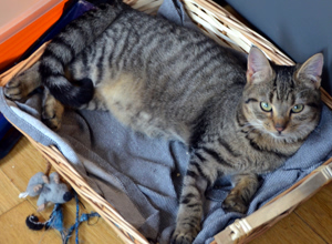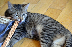 Nala mit ihrer zurückhaltenden und dann plötzlich aufbrausenden Art ist eine Wundertüte, man weiss nie genau, wo man bei ihr steht. So kann Nala sehr ruhig auf dem Stuhl liegen und plötzlich im nächsten Moment ist sie beim Spielen nicht mehr zu halten. Zazu ist dann schnell mal Nala’s Energie unterlegen. So kam es auch, dass sie den als Liegekorb gedachten Korb anbiss, wobei der Korb Tag für Tag ein wenig kleiner wird.