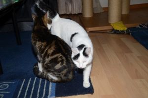 Manu genoss die letzten Stunden mit uns, knuddelte uns durch und spielte noch einmal ausgiebig mit uns, indem sie Bällchen warf oder die Angel herum schwang. Man merkte ihr an, dass ihr Herz schwer war, denn wir zwei sind so liebe Katzen und so verschmust, dass sie die Tage mit uns sehr genossen hat. Doch sie weiss, dass wir ein super tolles Zuhause bekommen und unser Frauchen sich total in uns verguckt hat und uns auf Händen tragen wird